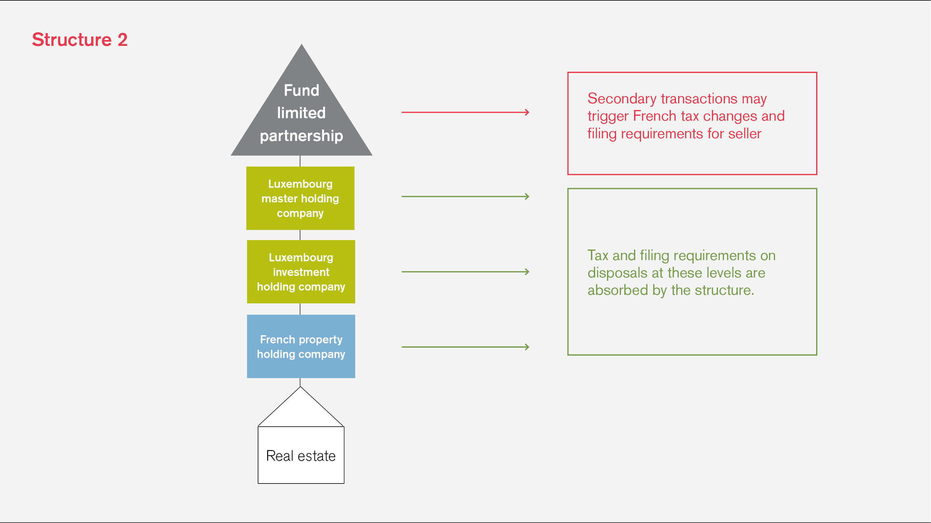 Take the structure above, which is set up such that on a disposal of the asset (be it by way of a direct sale of the property or a disposal of shares of the French company or its Luxembourg parent), the tax and filing obligations will be dealt with within the structure without a direct impact on investors.