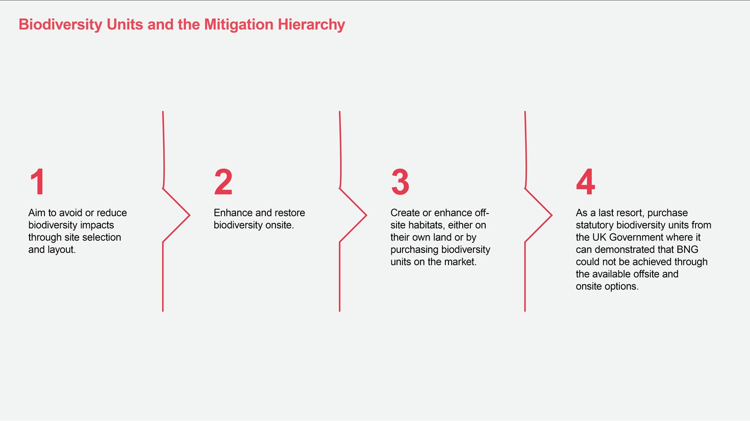 Developers are expected to approach BNG in a manner that is consistent with the existing biodiversity mitigation hierarchy2, reflecting the spatial hierarchy preference for local enhancements, by approaching developments in the following order: