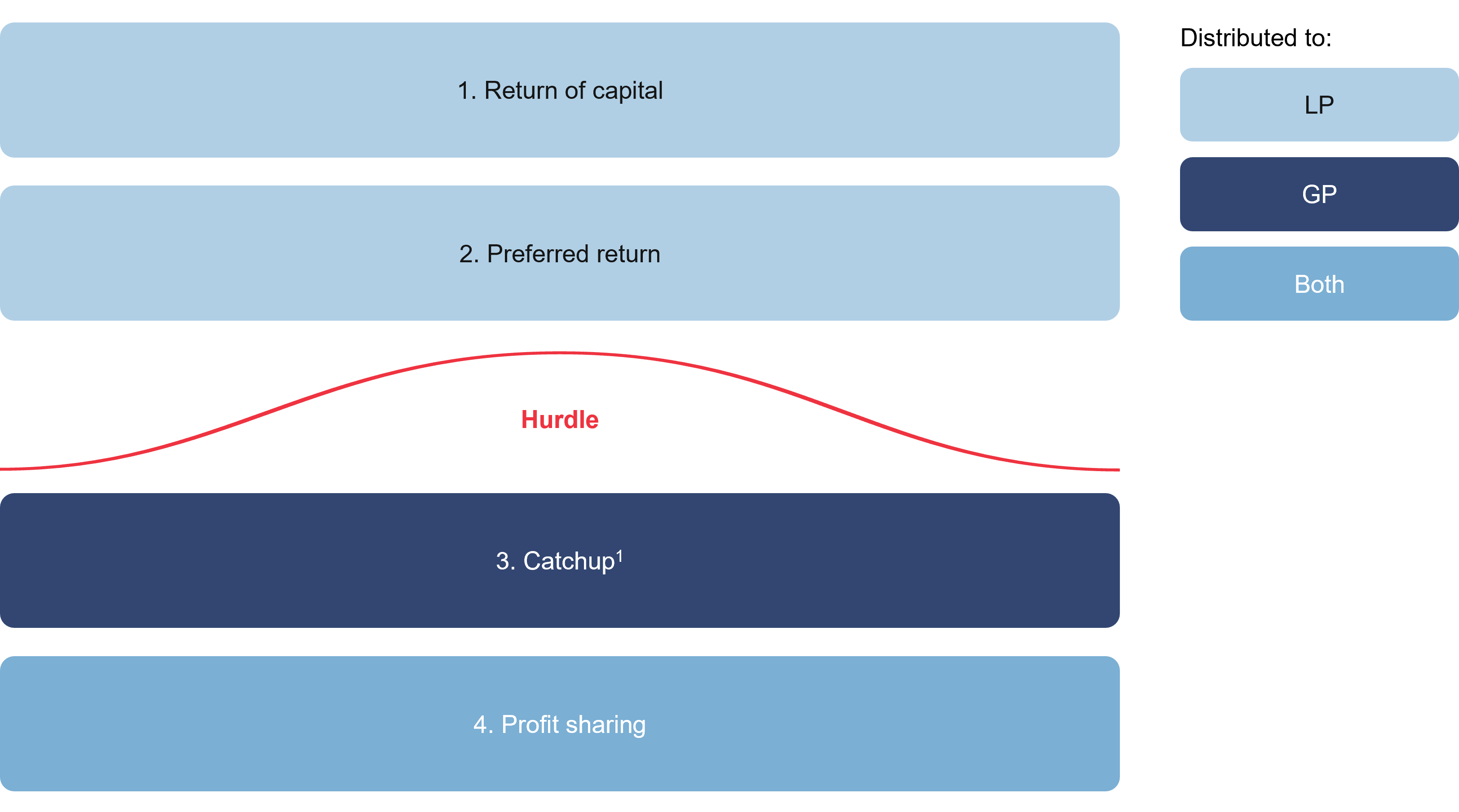 Hurdle rates, often referred to as preferred returns, set the minimum return required before GPs can start sharing in the profits with LPs. For example, if a fund has a 6% hurdle the GP will only receive any carry if the fund’s returns exceed this value i.e., after the LP has received its preferred return. Hurdles are an essential tool in aligning GP and LP interests as they prevent GPs from setting unrealistic return expectations and provide a layer of protection to LPs when profits are underwhelming.