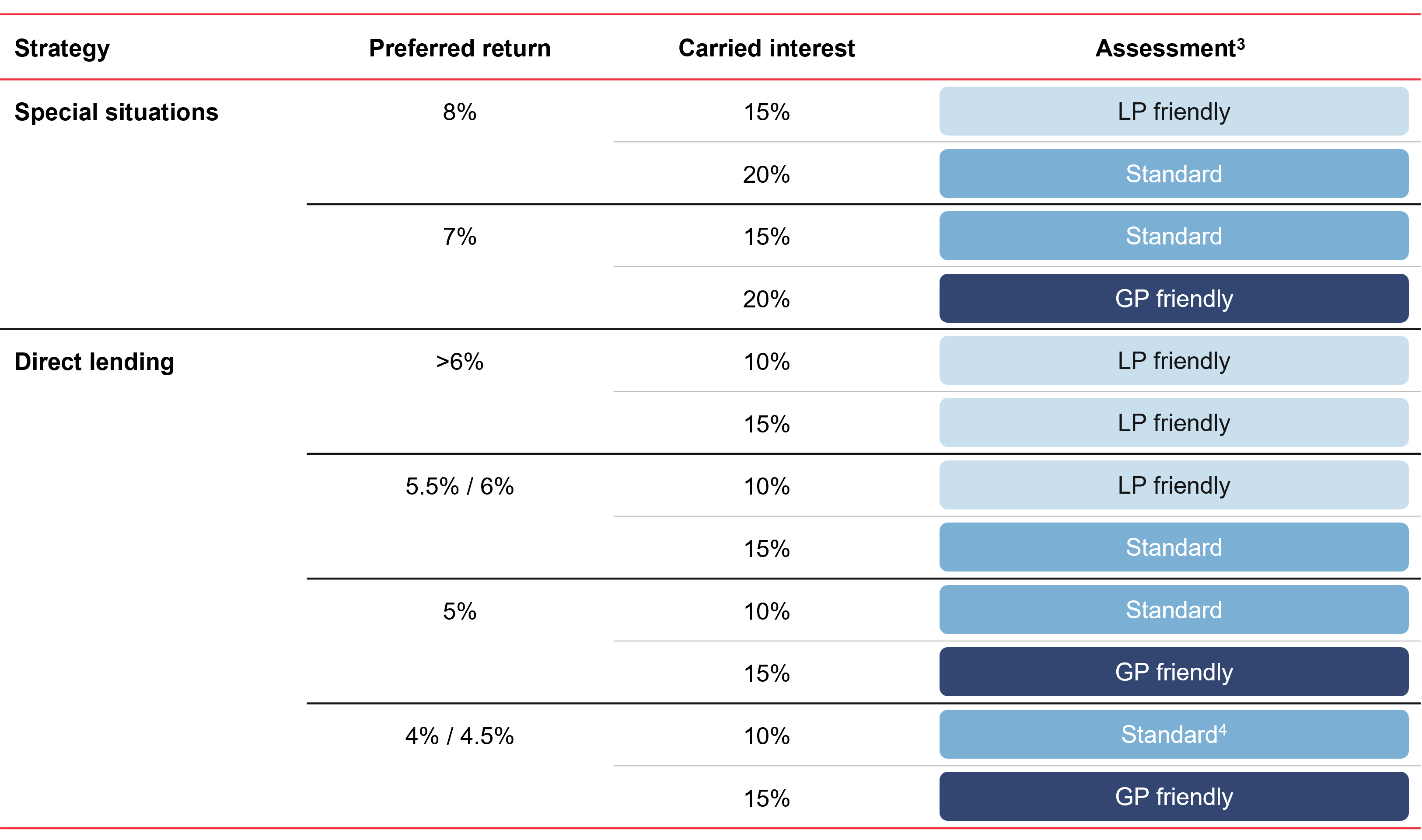 Due to the lower return profile, hurdle rates for direct lending are more nuanced than those for special situations with differences in the range of 50 basis points being common. Typically, hurdles for direct lending are in the 5% to 6% range.