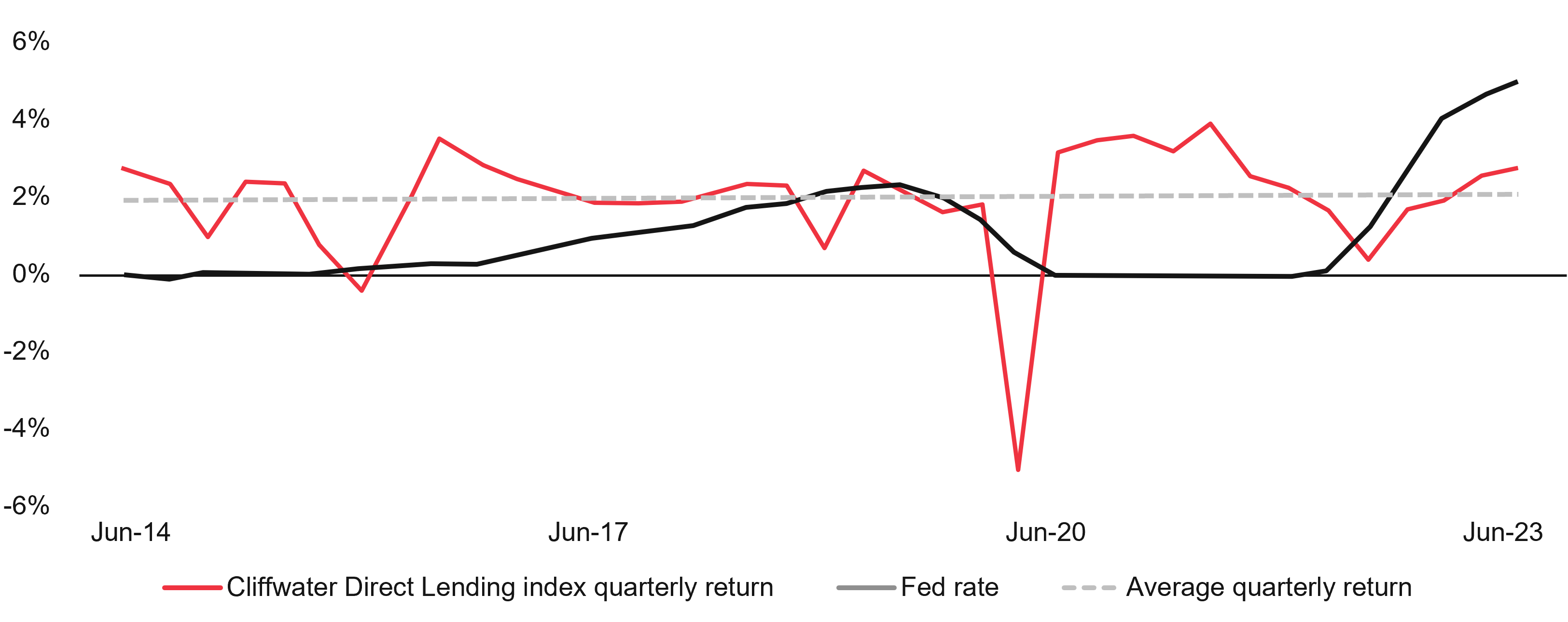 Another consideration is the actual return in direct lending and its correlation to higher interest rates over the past ten years. For this analysis, the US is a useful data source, as it has experienced higher interest rate variations in this period. The graph below shows a comparison of the US FED rate against the quarterly performance of the Cliffwater Direct Lending Index (CDLI)6, which provides performance data on direct lending loans originated by Business Development Companies (BDCs). This comparison suggests that, over the period analysed, there was no significant correlation between these two indicators. A potential explanation is that middle-market direct lending loans are neutral to duration risk (due to their floating rate) and are mostly impacted by their exposure to credit risk.