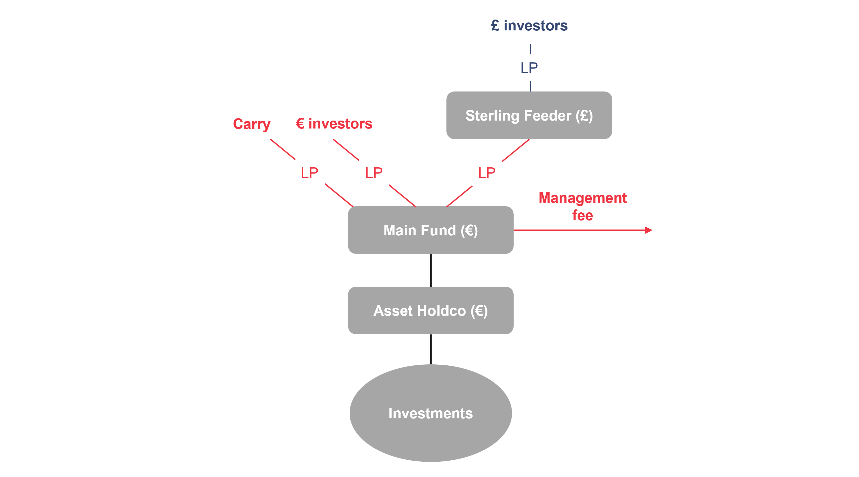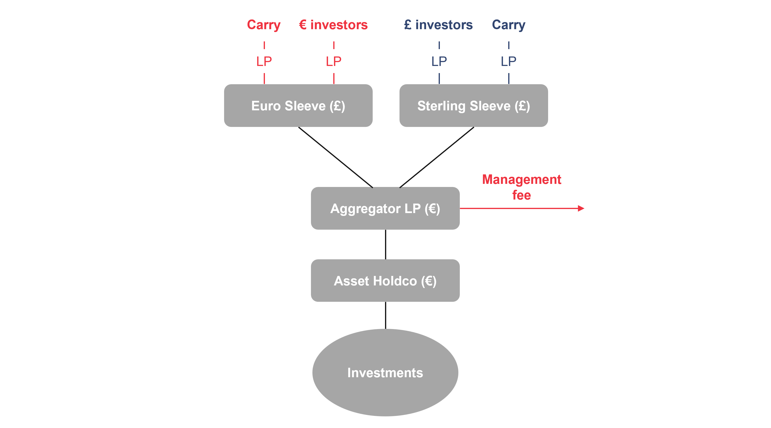 Under this structure, the fund operates a principal sleeve in euro, and one or more parallel sleeve each with their own functional currency. In this example, there is a sterling parallel sleeve sitting alongside the principal euro denominated vehicle. The management fee and carried interest are taken from each sleeve by reference to their functional currency ensuring full FX alignment between the house and the investors. Each sleeve generally has its own asset holding company (AHC) which will typically have the same functional currency as its parent sleeve1. Each sleeve takes commitments in their respective functional currency and draws down from investors and invests in its AHC, again in their functional currencies. Each time a sleeve makes an investment denominated otherwise than in its functional currency, the AHC will swap its currency for the currency of that investment and then hedge the resultant FX risk2. Deals are allocated between the parallel sleeves pro rata to their outstanding commitments from time to time, calculated in euro. It would be standard to use the exchange rate at the time of calculation resulting in each AHC having different shares of each investment if the relevant FX rates move.