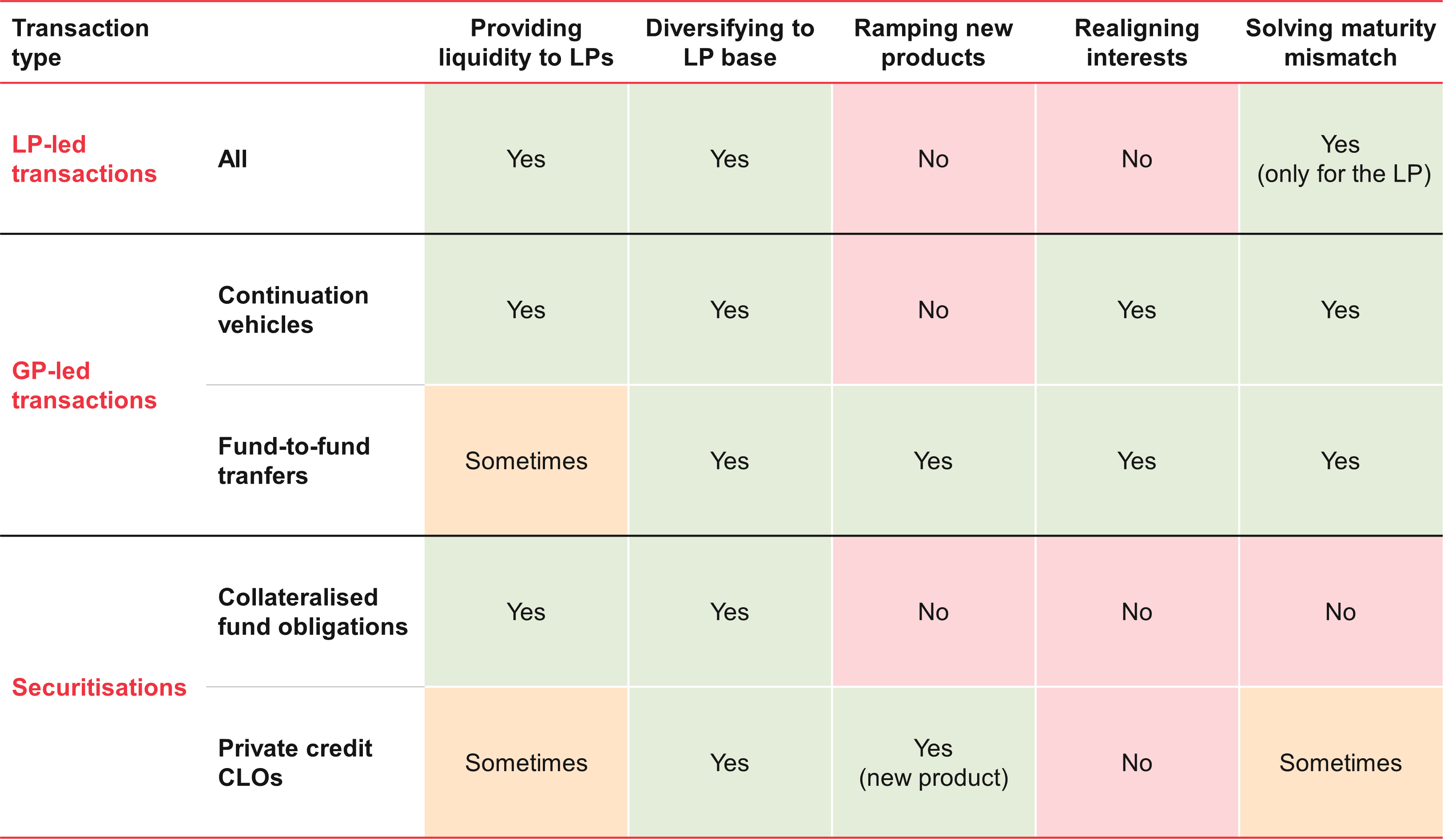 Figure 5: Summary of private credit secondary transaction types and their key drivers