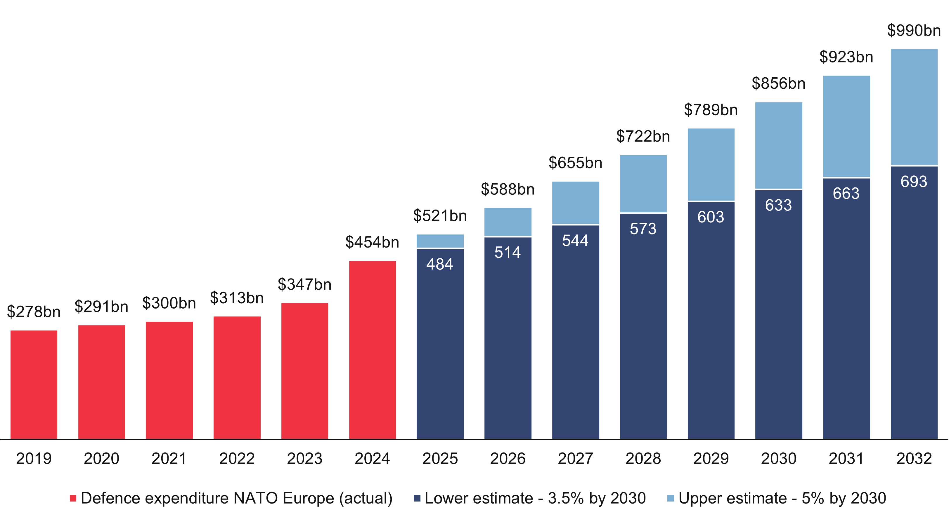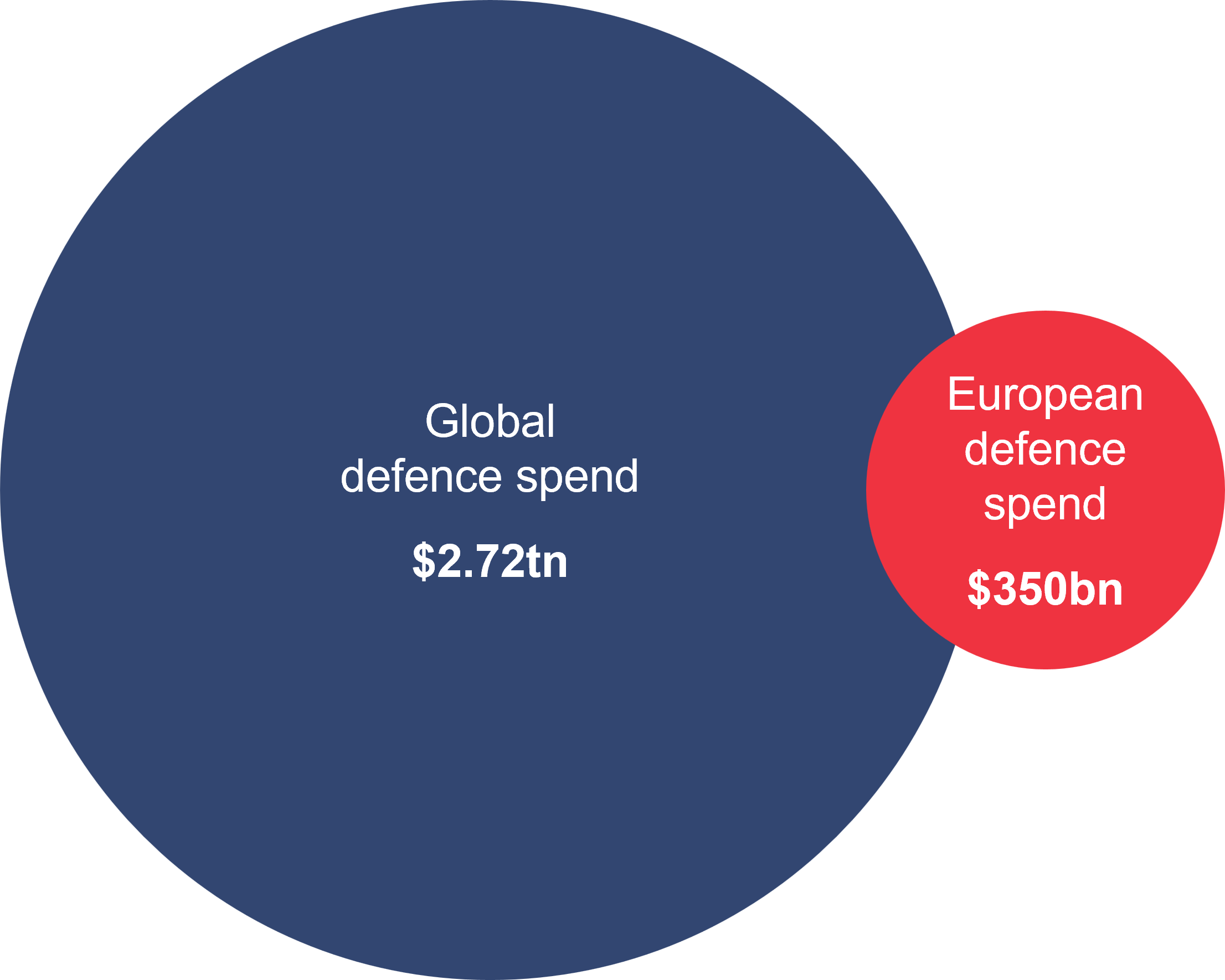 If a 5% defence spending target is agreed, defence expenditure could see an increase of $200bn by 2027 (compared to 2024 figures). Even if only the core target of 3.5% is met by 2032, that would still represent over $230bn in additional capital over the next seven years. The spending increases outlined above could represent a permanent shift toward higher baseline defence allocation.