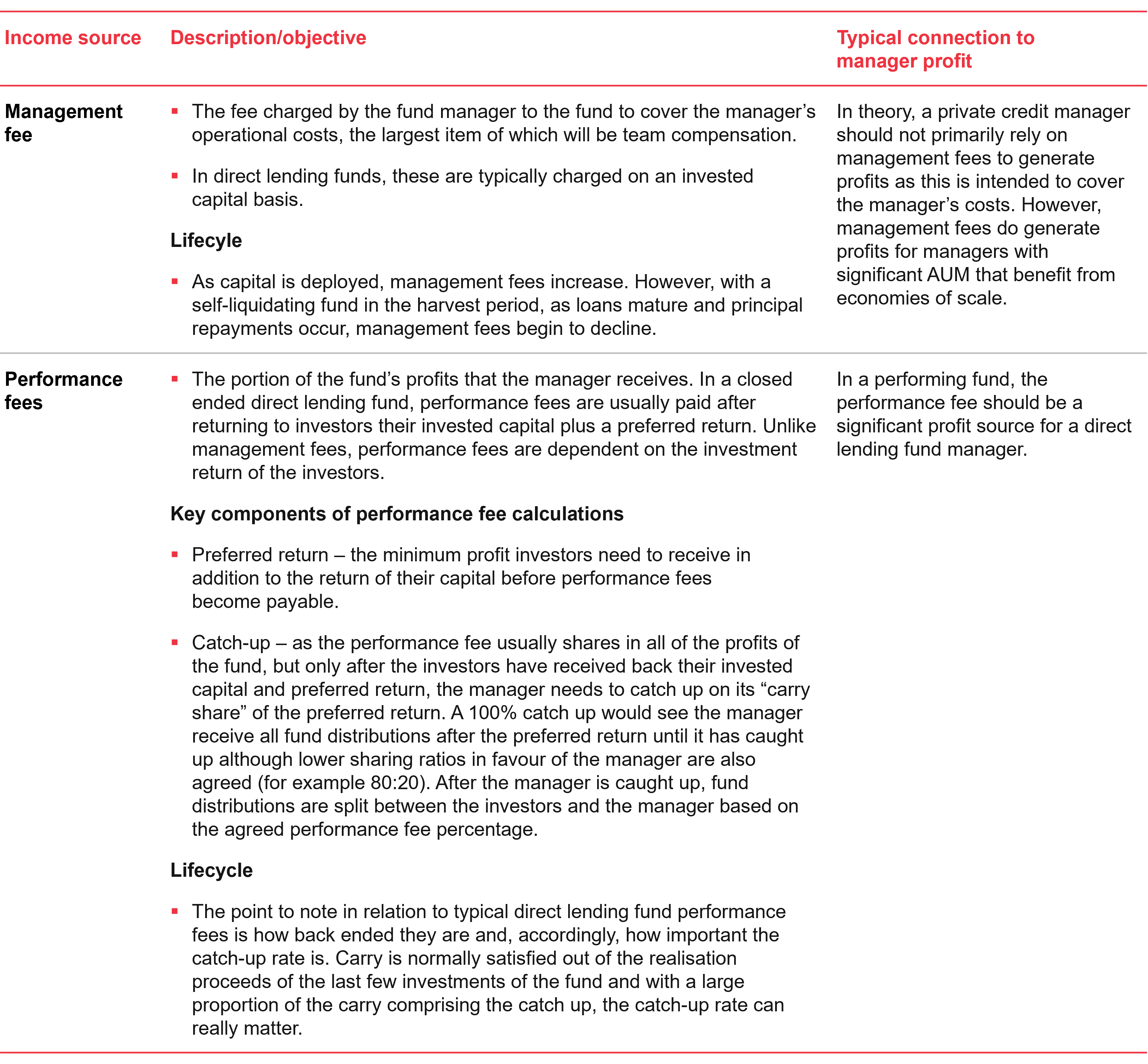 - As competition within the private credit market intensifies, we expect to see a rise in innovative fee structures where investors and managers could explore alternative fee arrangements using a blend of management fees, performance fees and arrangement fee sharing structures. A fundamental objective that such fee structures will need to achieve is to ensure that investors and managers remain aligned taking into account the risk/return profile of the direct lending investment strategy.