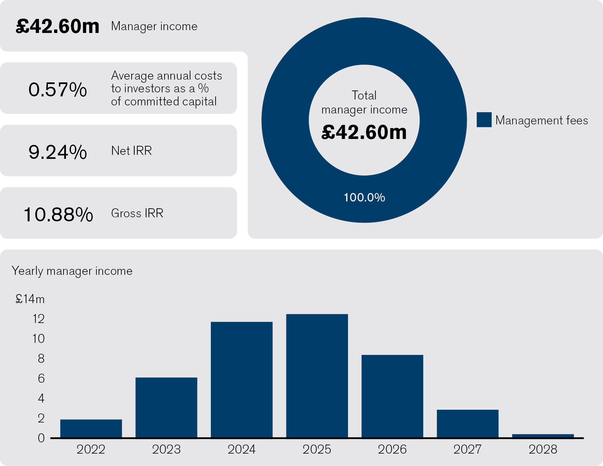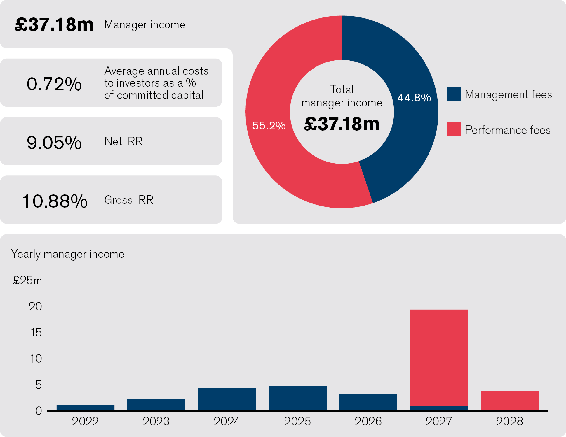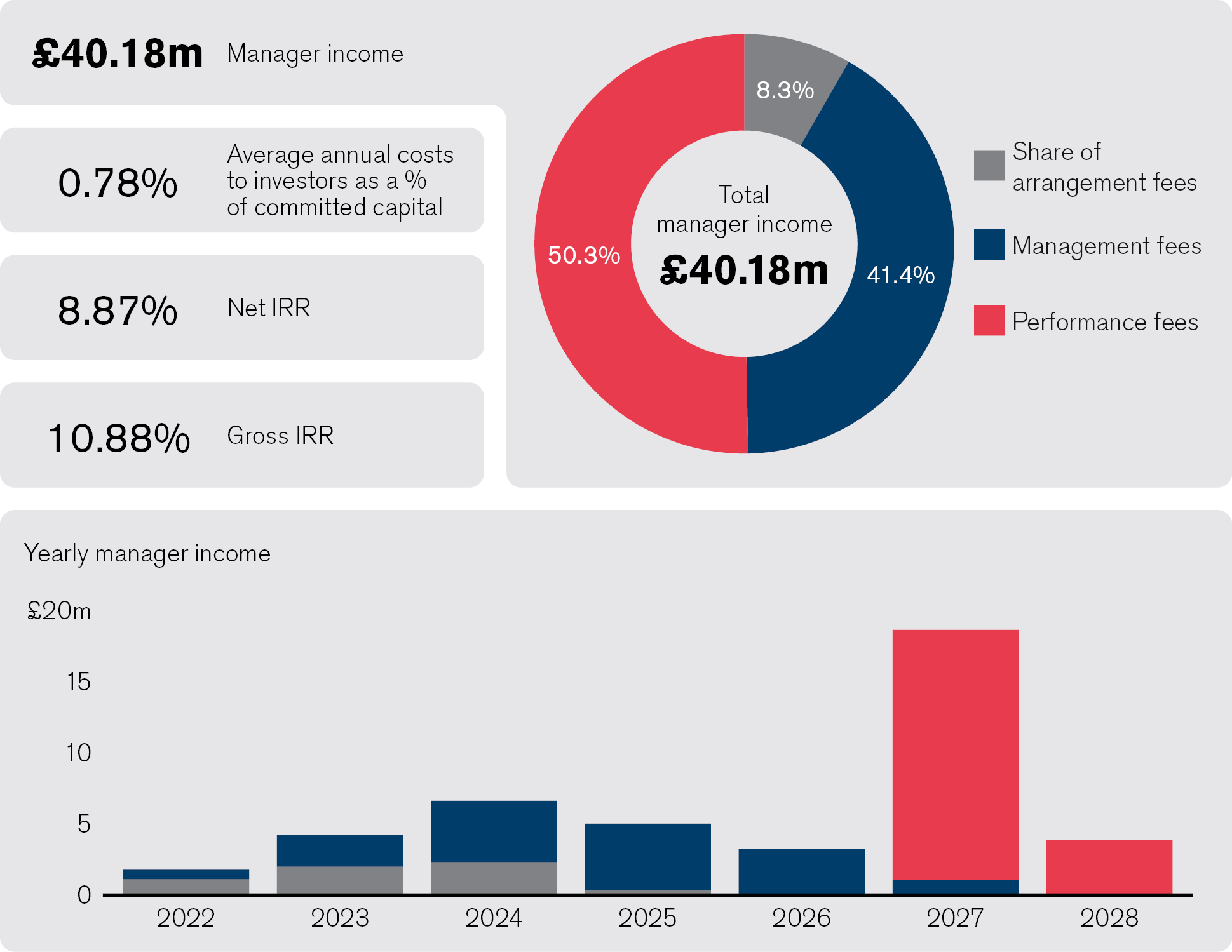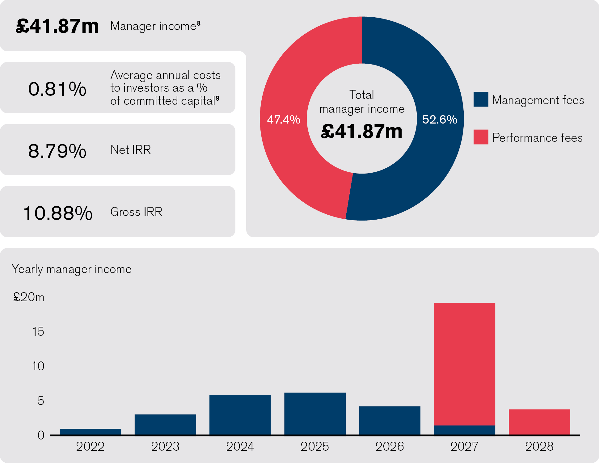 Based on the base case assumptions we can see how, over the life of the fund, manager income is broadly split 50/50 between management fee and performance fee.