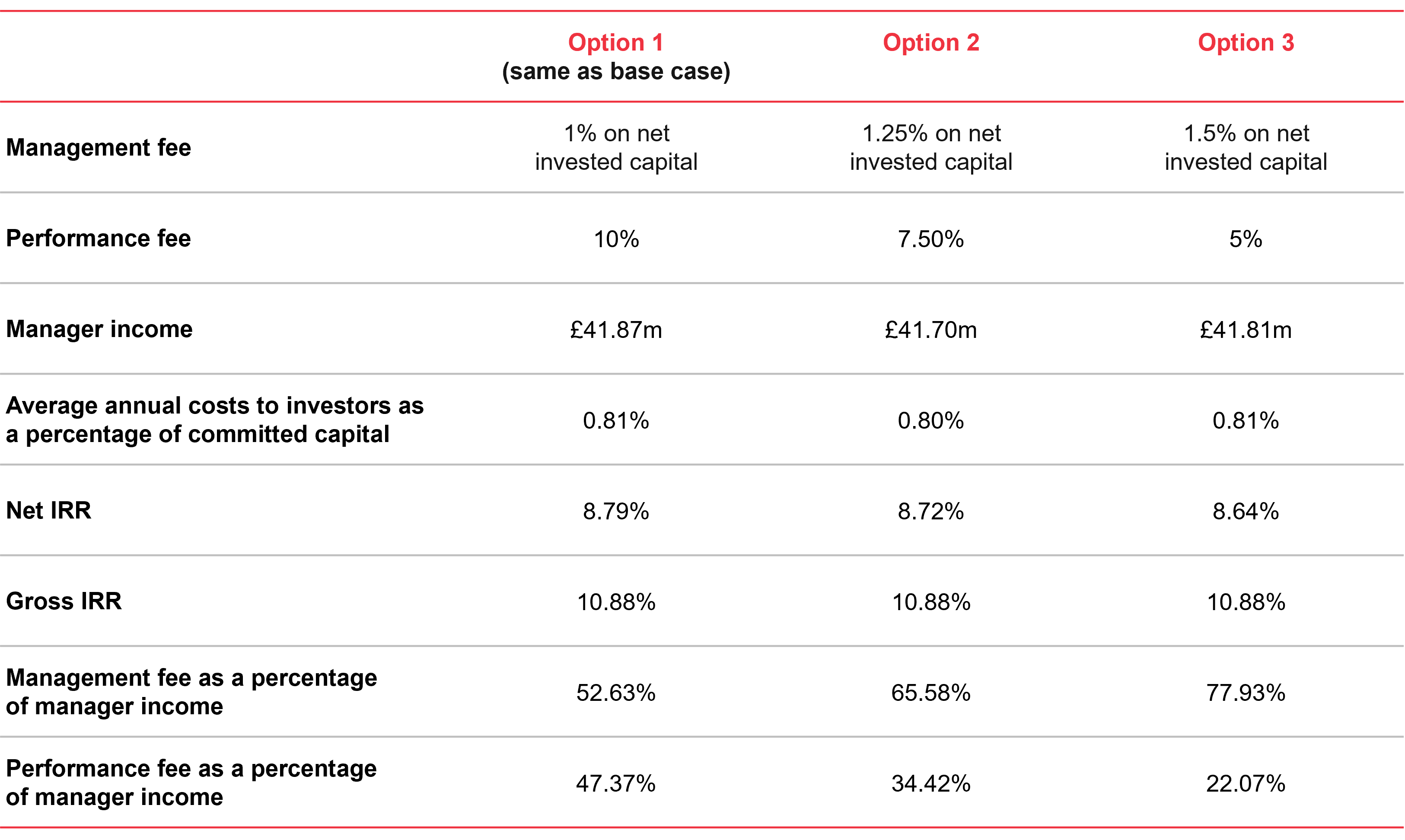 These options result in similar costs to investors but option 1 has a higher net IRR due to a greater portion of the cost to investors being incurred later in the fund life and therefore having a lower present value.