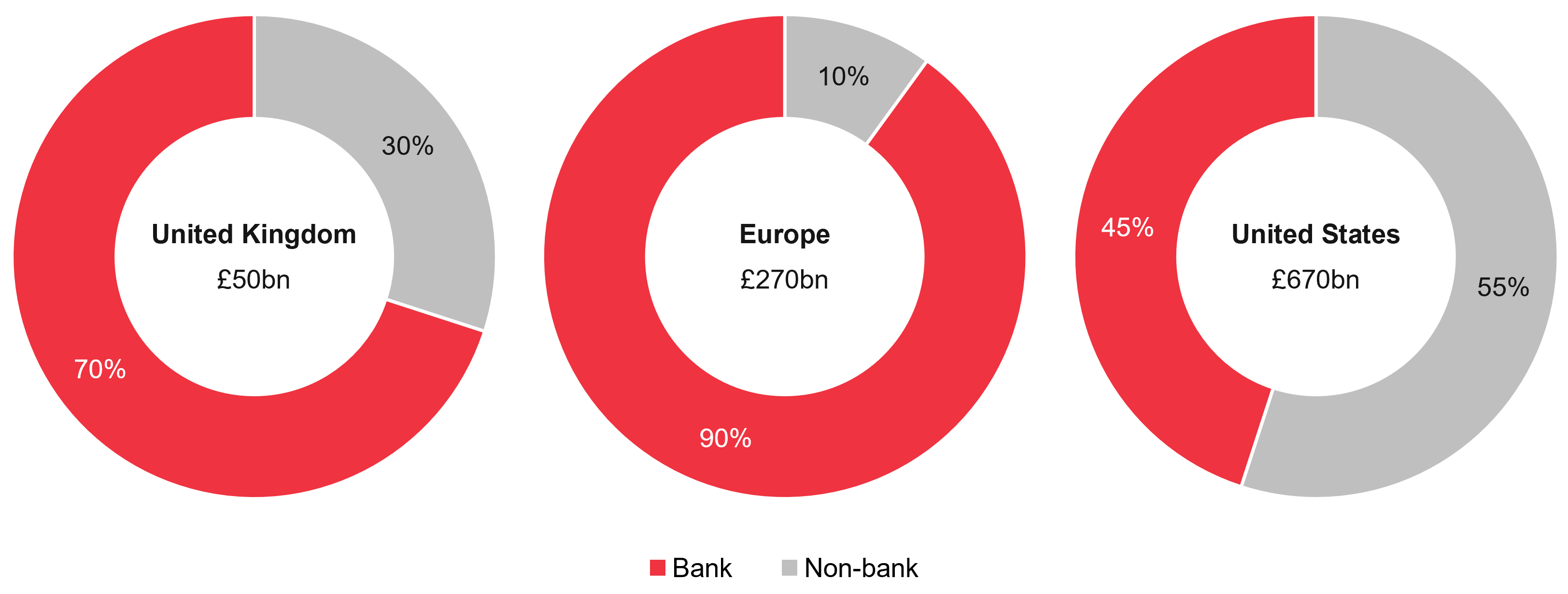 LTVs are derived at the time of loan origination by dividing the total committed credit amount by the total value of the property (plus any other collateral). Generally, the lower the LTV, the less risky the loan. The willingness to lend at different LTVs is a key differentiator between banks and non-bank lenders, with the latter accepting on average higher LTVs (although also charging a corresponding higher margin to recognise the increased risk). Initial LTVs above 60% make up less than 15% of UK banks’ loan books, whilst for debt funds they represent more than 55%7.