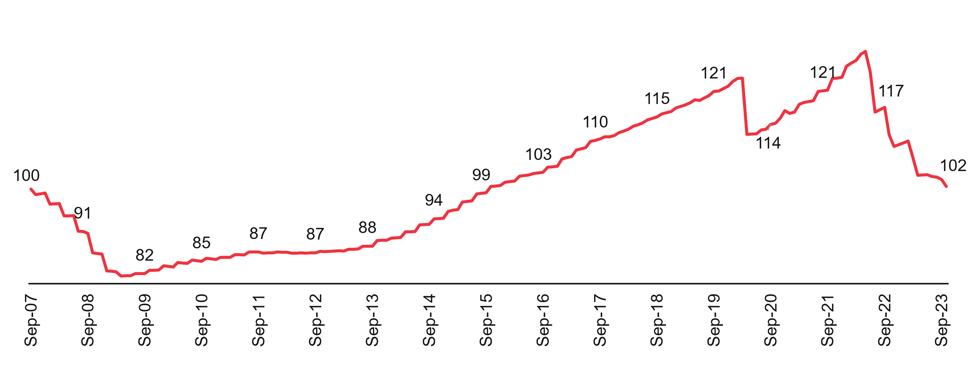 Indexed to 100 in September 2007