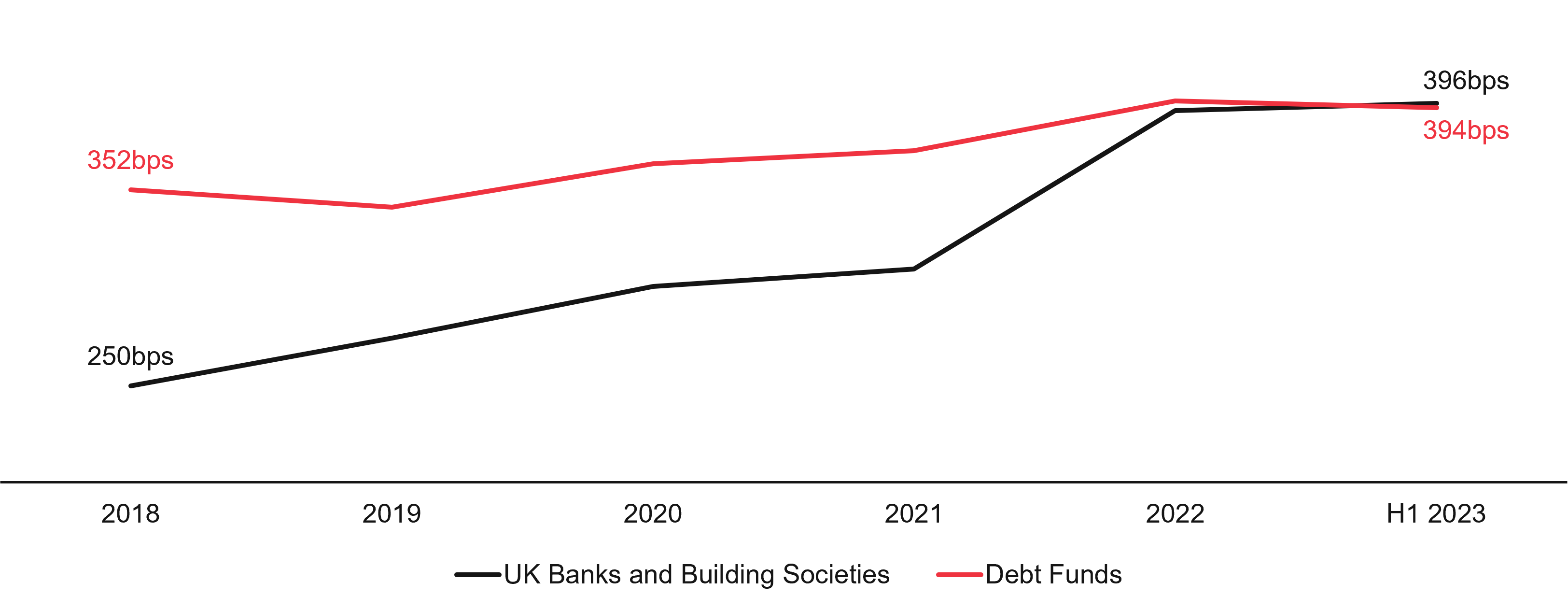 The initial real estate debt funds set up after the GFC were almost exclusively focused on mezzanine or other subordinated debt. As bank lending falls, fund managers are seeing opportunities further up the payment priority and are in theory able to negotiate better terms. Whilst previously more senior loans in real estate did not often meet the target returns of alternative lenders, the growth mainly in base rates but also in margins has made these safer loans more attractive. In 2018, the difference between the margins offered by banks and debt funds was on average 100 basis points across sectors, since then there has been a significant convergence.