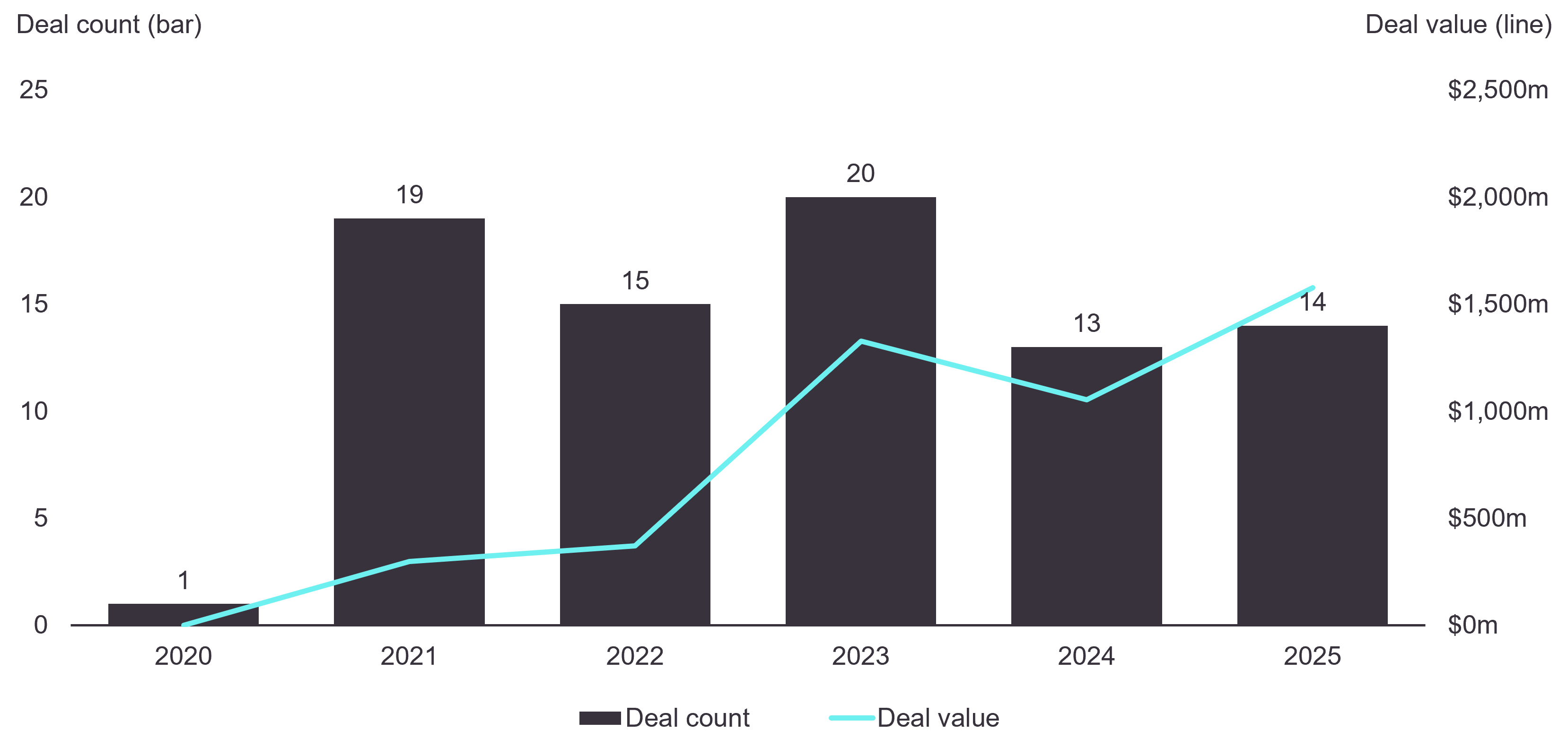 Figure 2: Disclosed aggregate value by geography: 2020-2025 (USD FX normalised)