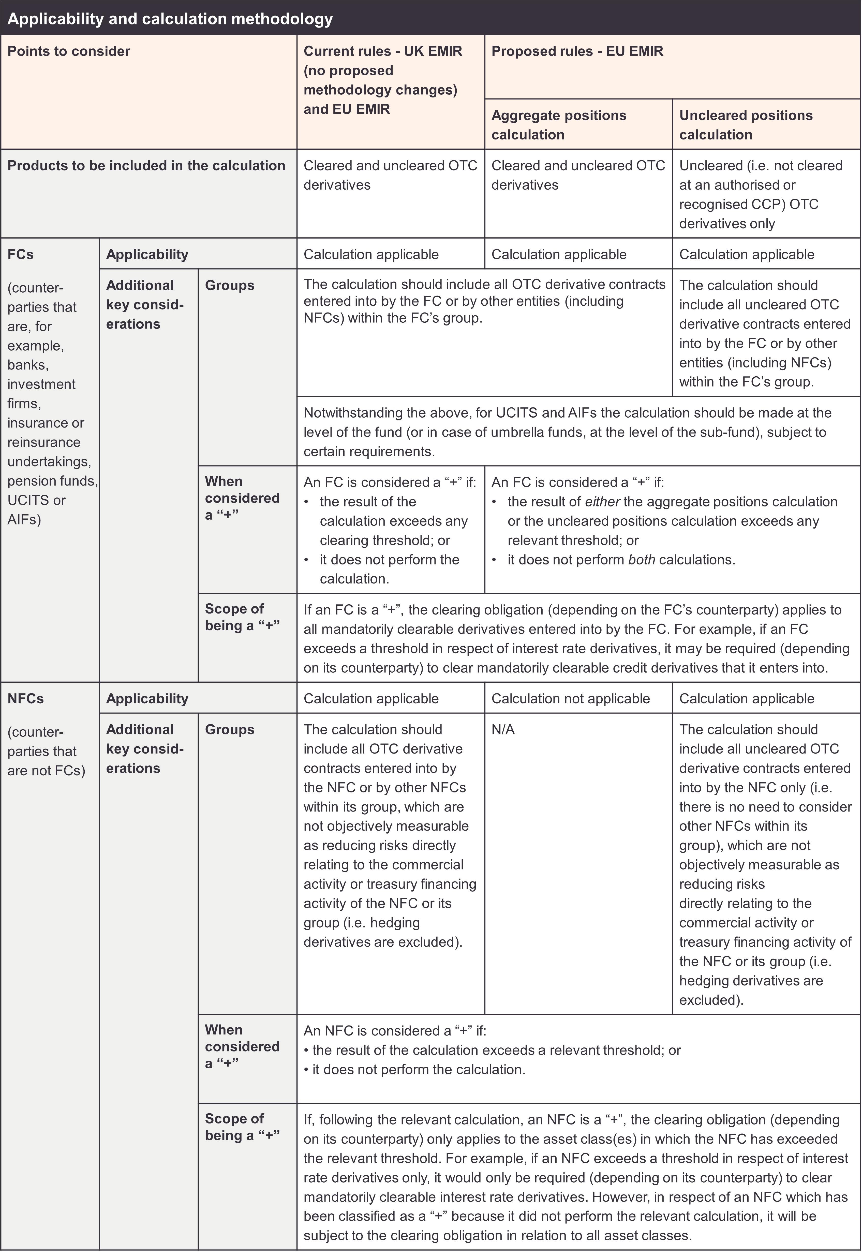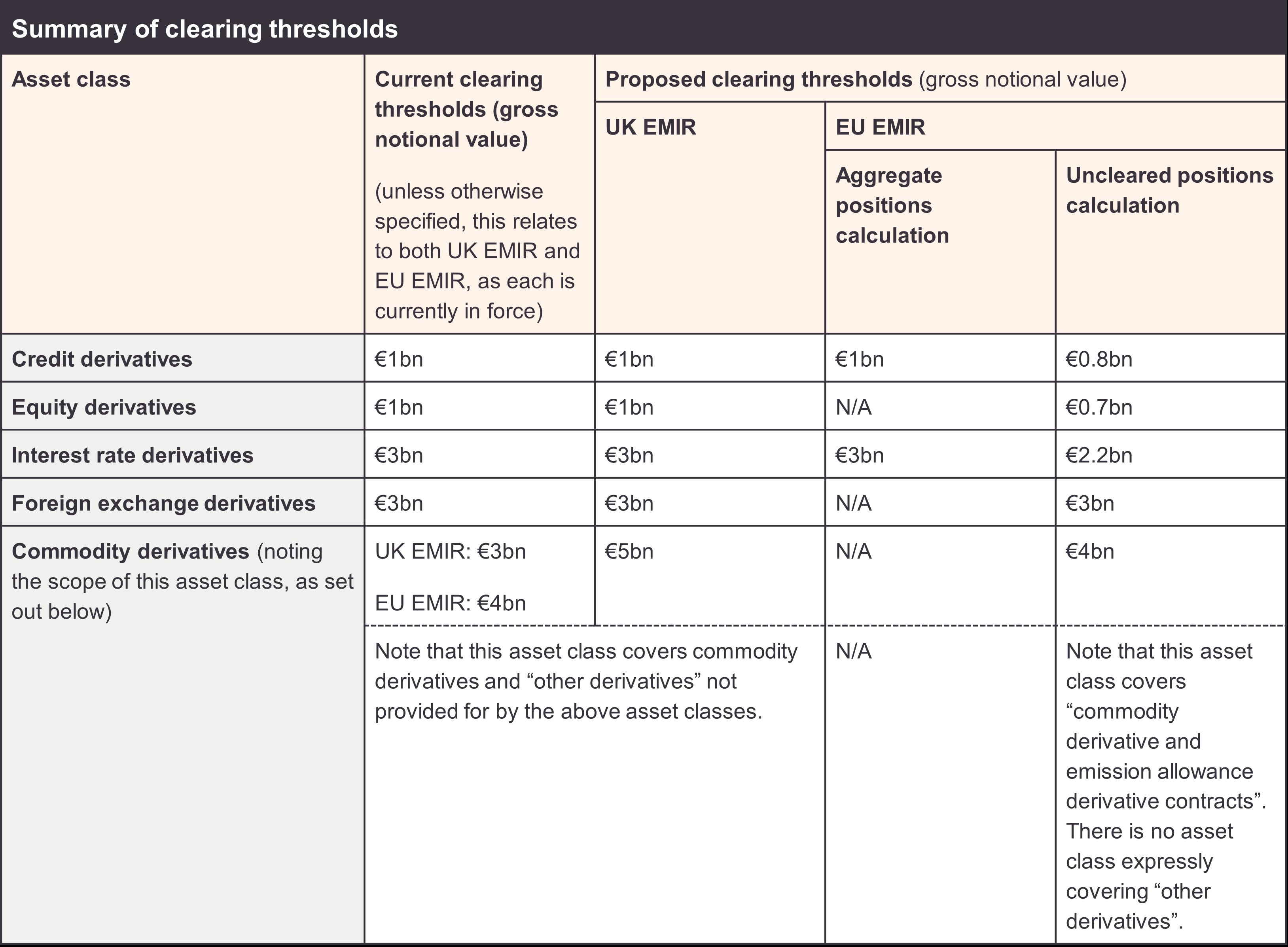 We summarise in the table below the current clearing thresholds and each of the proposed changes.