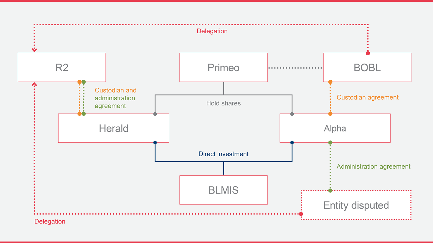 Herald employed R2 as its custodian and administrator. Alpha employed Bank of Bermuda Limited (BOBL) as its custodian, which in turn appointed R2 as sub-custodian. It was not clear who Alpha’s administrator was but, in practice, R2 also acted as its sub-administrator. Alpha had no contractual relationship with R2, and neither Herald nor Alpha had any contractual relationship with R1.