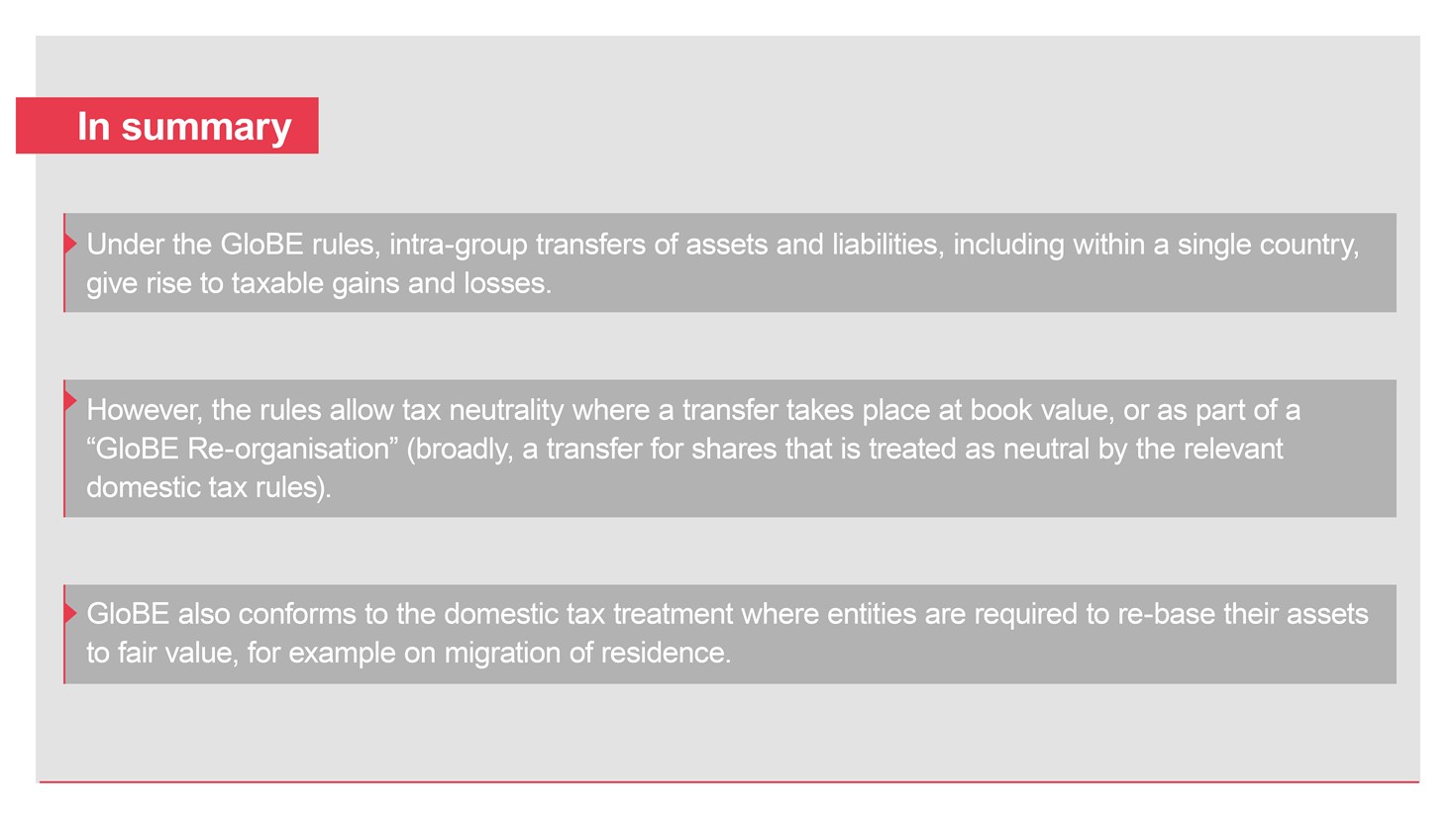 Together with allowing transfers to take place at book value, the rules on GloBE reorganisations will often allow intra-group restructuring such as the hive-down of a business prior to its sale to a third party to take place effectively on a tax-neutral basis, as is typically the case under domestic tax rules.