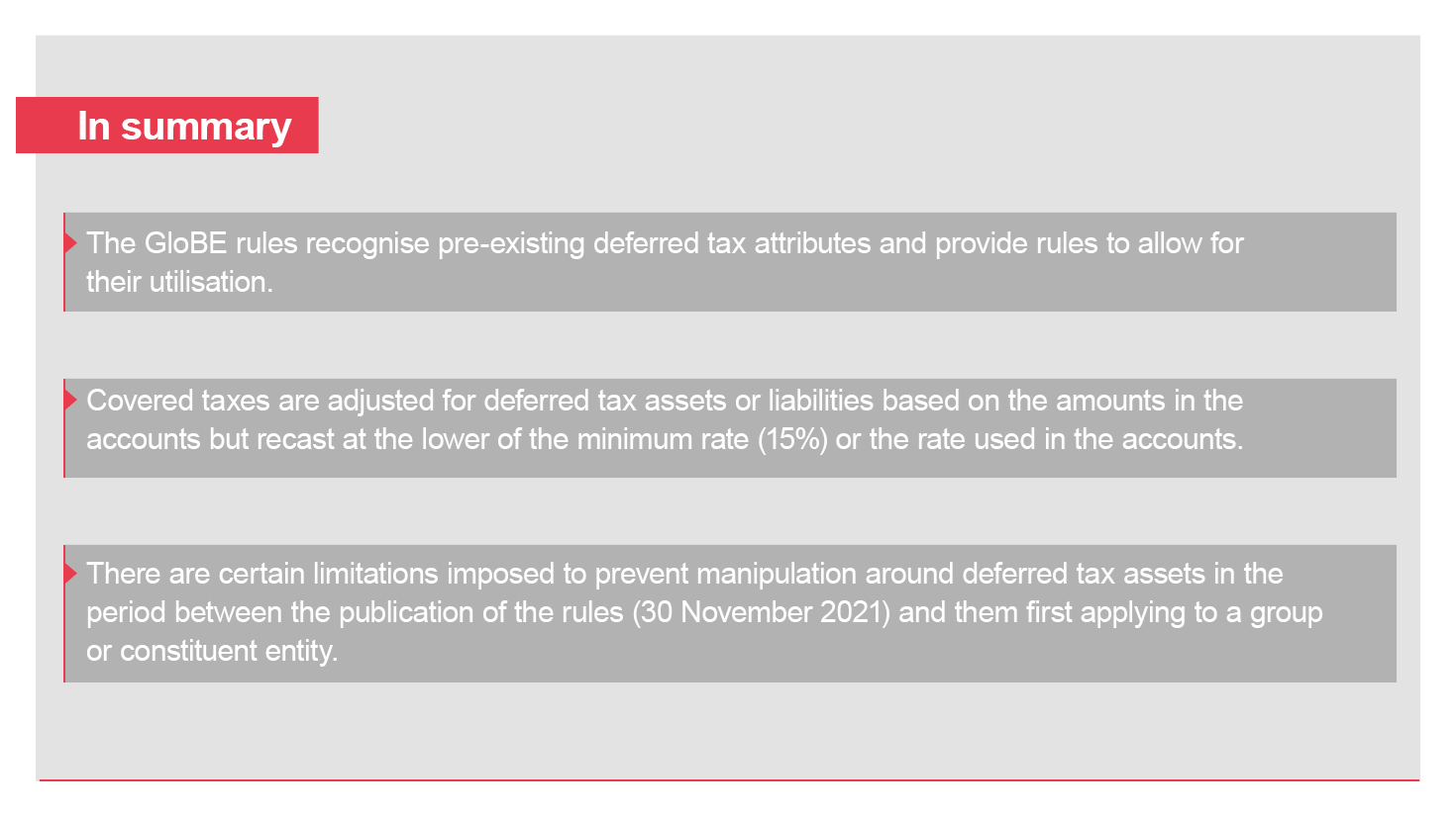 The GloBE rules recognise that deferred tax attributes may have been generated in the years before the group or Constituent Entity becomes subject to the rules for the first time but then unravel afterwards. For example, losses that have arisen in a period before the entity became subject to the Globe rules which are available to set against future profits (and therefore reduce local tax payable) when within the GloBE rules will be commonplace. Without rules to recognise the historic deferred tax asset it could result in an unfair GloBE tax charge.