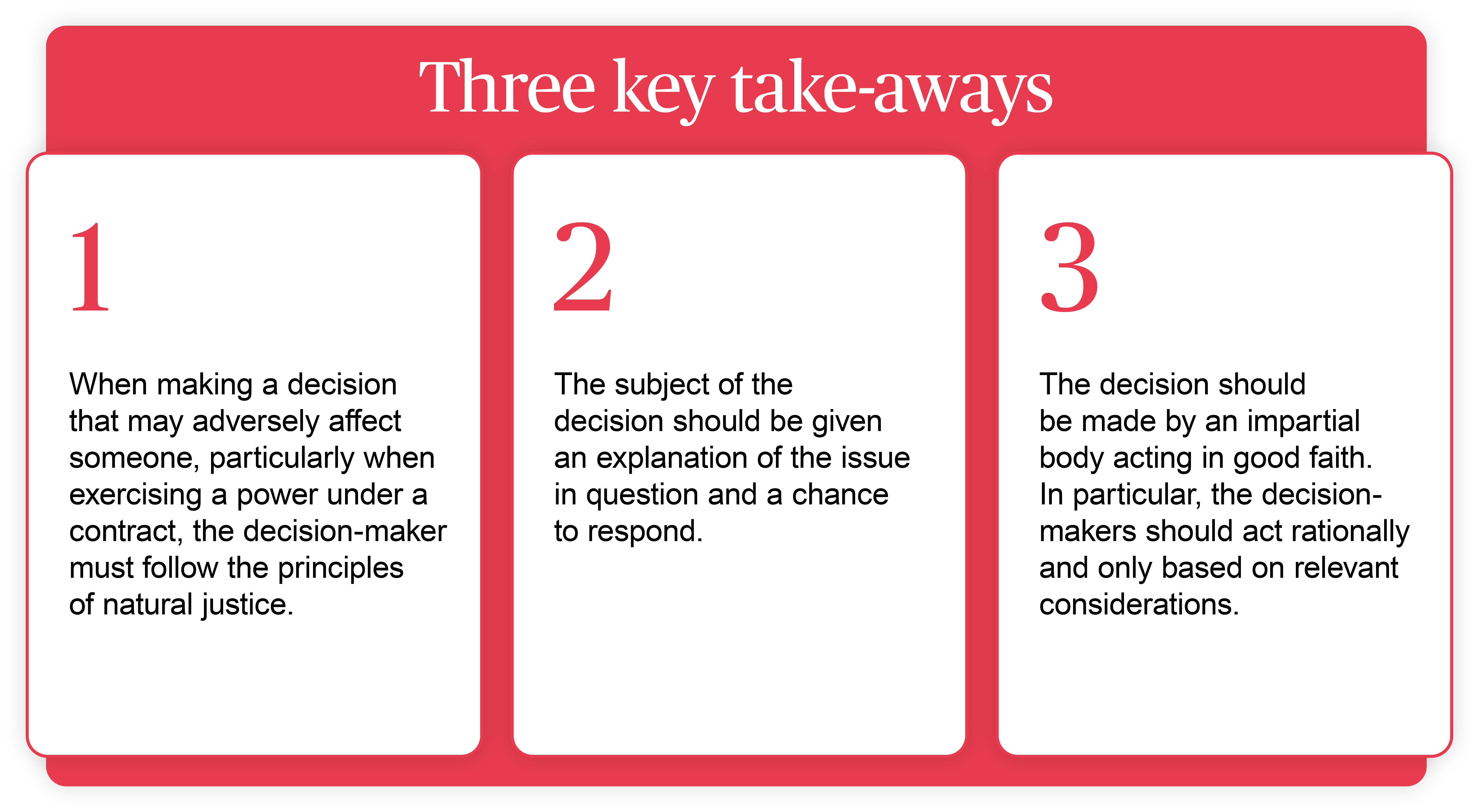 Fundamentally, natural justice requires a decision-maker (whether an individual or a body) to act fairly when reaching a decision.